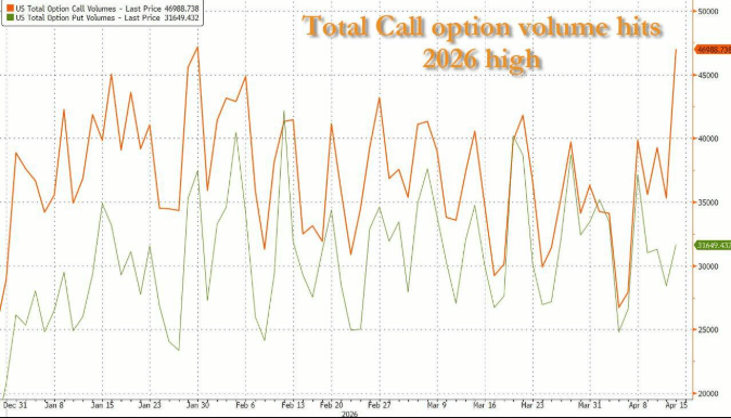 这一错位正迫使对冲基金近乎盲目地追涨,并直接推动了近期期权市场的异常活跃——昨日(4月15日)录得2026年以来最大单日看涨期权成交量。